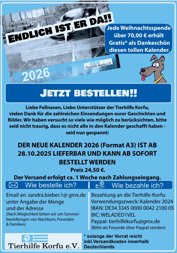 Pflegestelle zu sein bedeutet gleich 2 Leben zu retten - das des Pflegehundes und das Leben des Hundes, der auf seinen Platz im Tierheim oder in eine Pflegestelle auf Korfu nachrücken kann...
